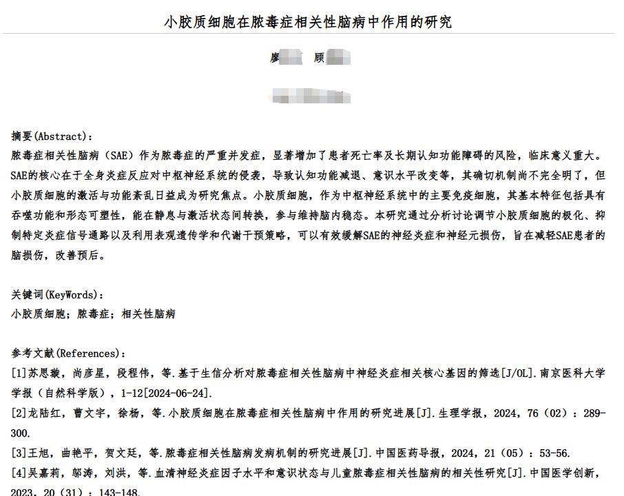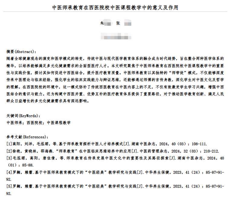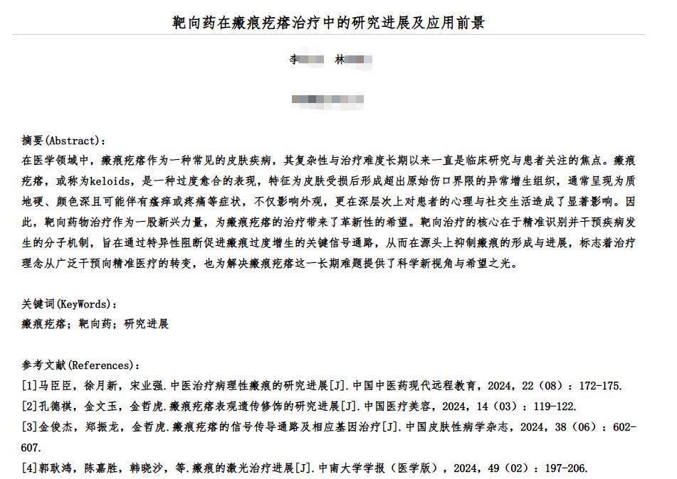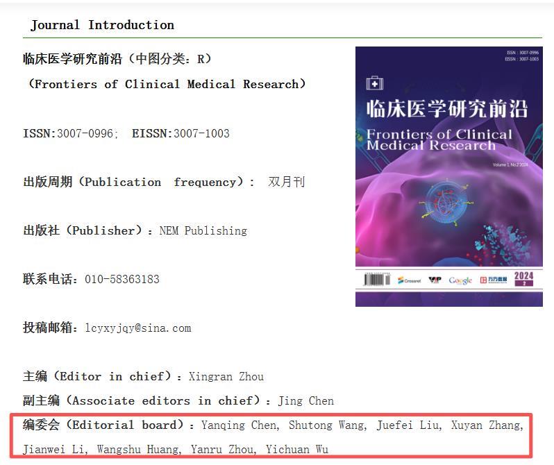 此外,上述出版社网站披露了《临床医学研究前沿》2024年第二期目录,公布了7篇论文的标题、作者、单位、摘要、关键词、参考文献等。值得注意的是,其中,《靶向药在瘢痕疙瘩治疗中的研究进展及应用前景》《小胶质细胞在脓毒症相关性脑病中作用的研究》《中医师承教育在西医院校中医课程教学中的意义及作用》等3篇论文与知网中可查询到的论文题目一致或接近,但知网收录的三篇同名论文的作者姓名、单位、摘要、参考文献等信息,均与《临床医学研究前沿》网站披露的论文信息不同。