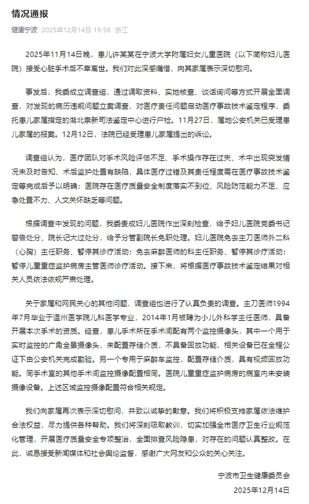 14日,宁波市卫生健康委员会通报患儿手术后离世一事,全文如下:
