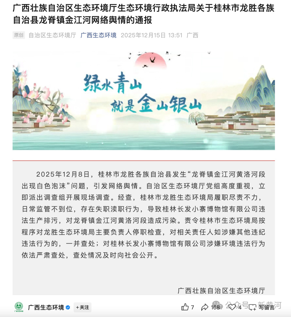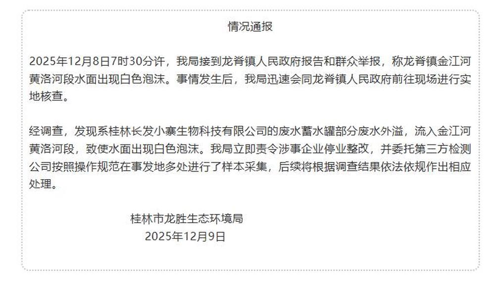 通报称,2025年12月8日,桂林市龙胜各族自治县发生“龙脊镇金江河黄洛河段出现白色泡沫”问题,引发网络舆情。自治区生态环境厅党组高度重视,立即派出调查组开展现场调查。经查,桂林市龙胜生态环境局履职尽责不力,日常监管不到位,存在失职渎职行为,导致桂林长发小寨博物馆有限公司违法生产排污,对龙脊镇金江河黄洛河段造成污染。责令桂林市生态环境局按程序对龙胜生态环境局主要负责人停职检查,对相关责任人如涉嫌其他违纪违法行为的,一并查处;对桂林长发小寨博物馆有限公司涉嫌环境违法行为依法严肃查处,查处情况及时向社会公开。