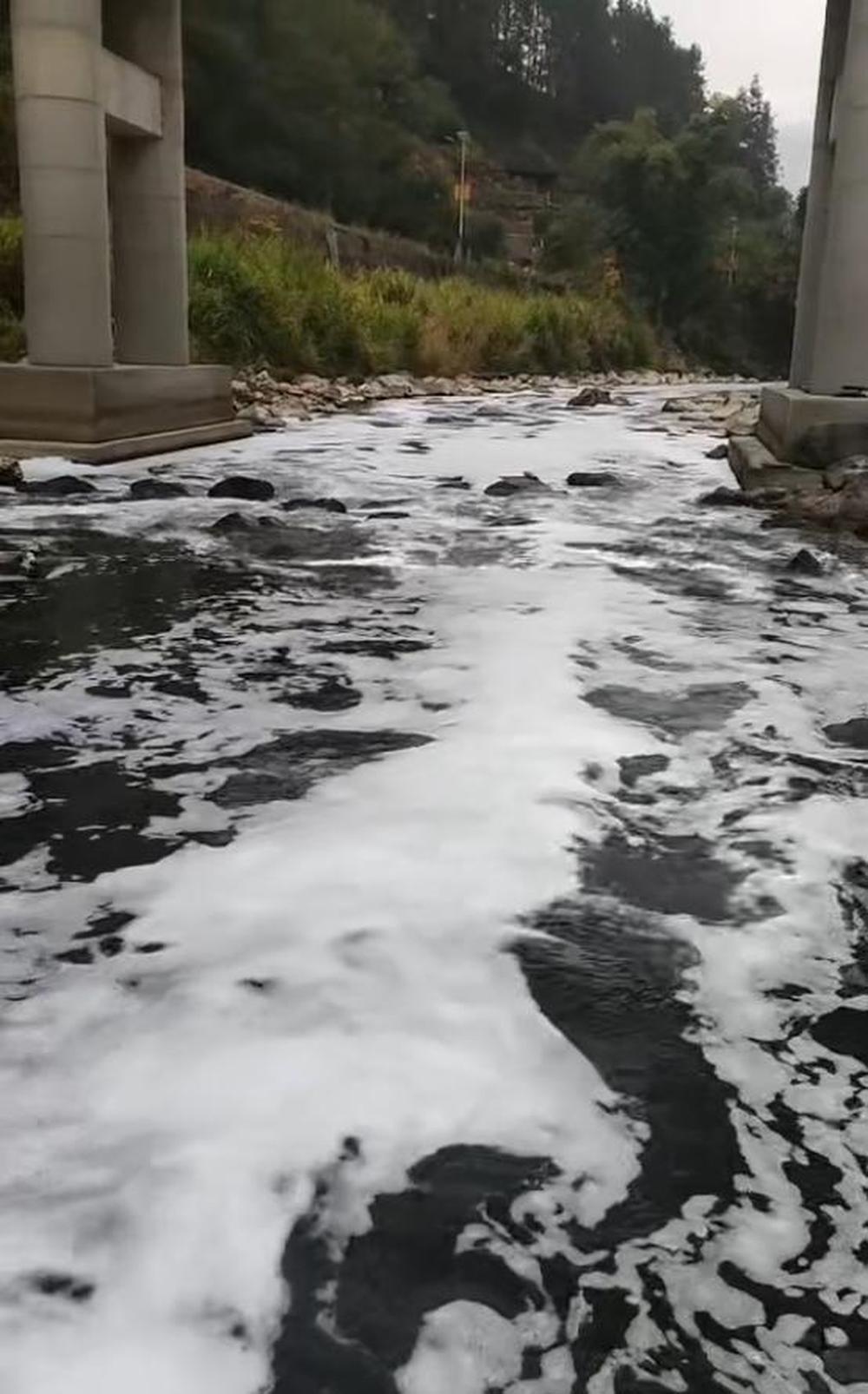 网友发布的视频显示,一条几十米宽的河道内,白色泡沫顺流而下,百米开外仍清晰可见。在河道一些回弯处,泡沫积了厚厚一层。