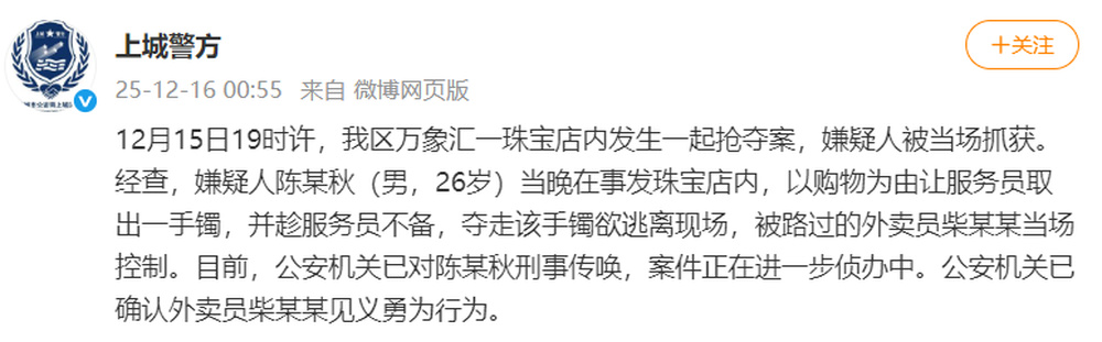 12月15日19时许,我区万象汇一珠宝店内发生一起抢夺案,嫌疑人被当场抓获。经查,嫌疑人陈某秋(男,26岁)当晚在事发珠宝店内,以购物为由让服务员取出一手镯,并趁服务员不备,夺走该手镯欲逃离现场,被路过的外卖员柴某某当场控制。目前,公安机关已对陈某秋刑事传唤,案件正在进一步侦办中。公安机关已确认外卖员柴某某见义勇为行为。
