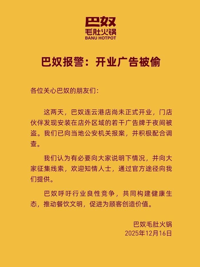 据16日巴奴火锅发布的信息显示,“巴奴连云港店安装在店外区域的若干广告牌于夜间被盗,巴奴火锅已向当地公安机关报案,并积极配合调查。”此外,巴奴火锅还向知情人征集相关线索。另据自称该店刘店长在社交媒体发布信息称,原本悬挂在连云港苏宁广场2到5楼的广告牌,目前仅剩下2楼和3楼的还在,其余楼层广告牌不翼而飞。