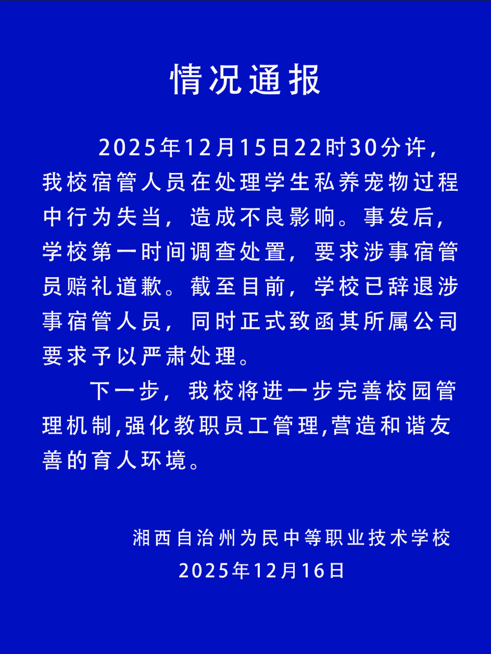 16日,当事学校发布情况通报称,12月15日22时30分许,学校宿管人员在处理学生私养宠物过程中行为失当,造成不良影响。事发后,学校第一时间调查处置,要求涉事宿管员赔礼道歉。截至目前,学校已辞退涉事宿管人员,同时正式致函其所属公司要求予以严肃处理。下一步,学校将进一步完善校园管理机制,强化教职员工管理,营造和谐友善的育人环境。