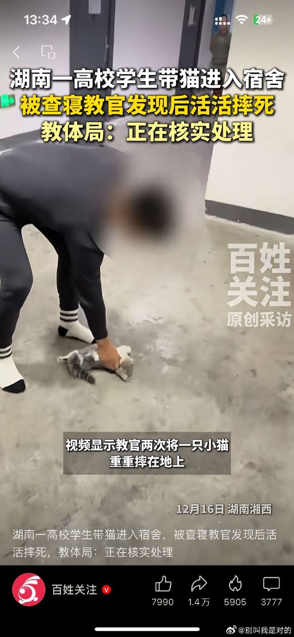近日,湖南湘西一职校教官当学生面摔死幼猫一事引发关注。湖南湘西自治州为民中等职业技术学校一名教官,被曝发现学生带小猫进宿舍,当着学生的面将猫摔死。12月16日晚,湖南湘西州为民中等职业技术学校发布情况通报称,学校已辞退涉事宿管人员,同时正式致函其所属公司要求予以严肃处理。