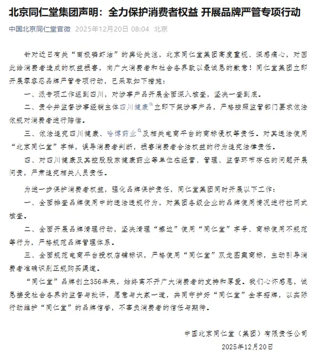 12月20日稍早,据北京日报报道,中国北京同仁堂官微发文: