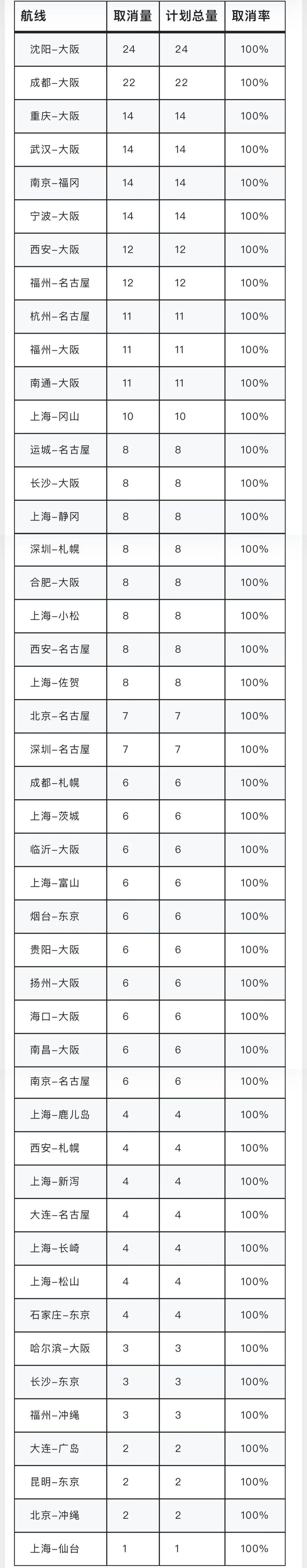 航班管家最新统计显示,2026年1月中国大陆往返日本航班取消量已达2195班次,整体取消率40.4%;其中46条中日航线在未来两周(2025年12月23日—2026年1月5日)内计划航班全部取消,取消率100%,涉及中日双方共38座机场。