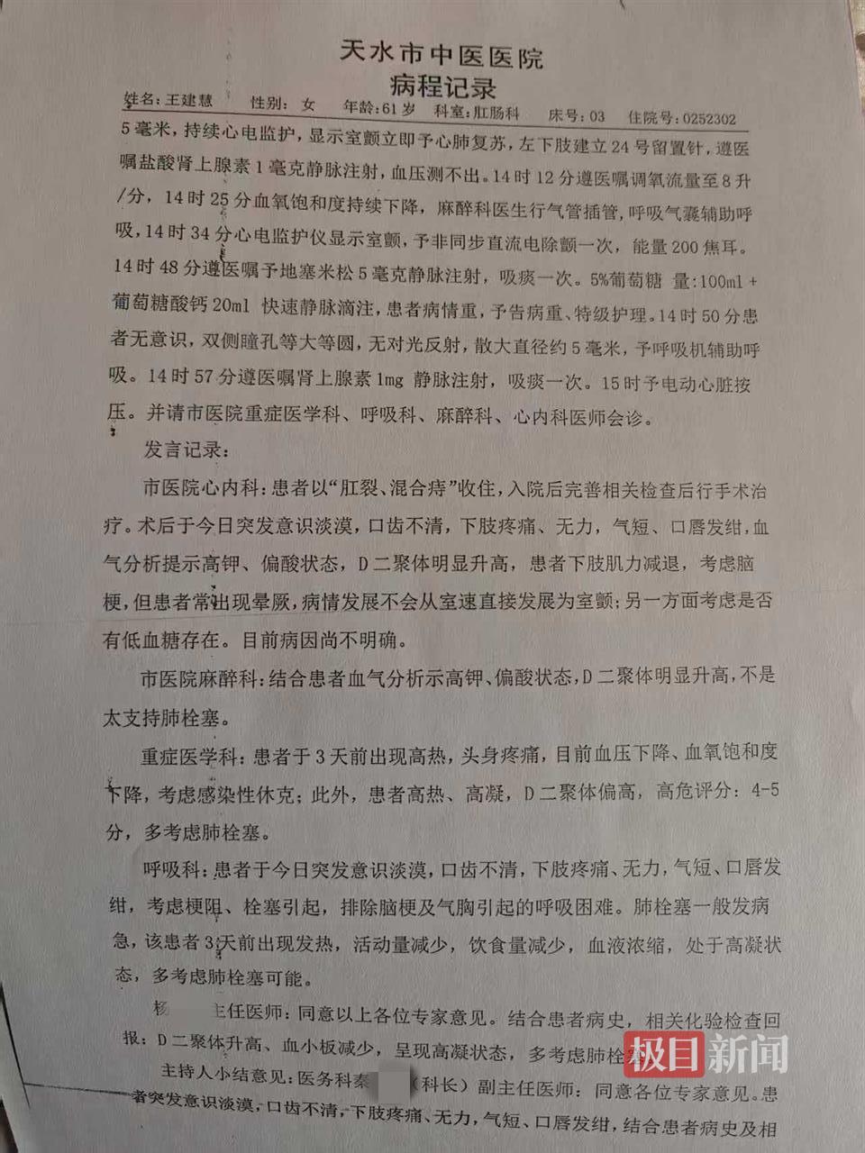 石先生说,他的母亲王建慧今年61岁。12月1日,母亲因患痔疮前往天水市中医医院肛肠科治疗,入院时各项检查指标均正常,母亲无任何基础病史,身体状况良好,完全符合手术标准。次日医院为母亲实施了痔疮手术。术后初期,母亲未出现明显异常。12月10日,母亲开始出现屁股、双腿疼痛的症状,当晚父亲去找值班医生反映情况,未得到重视,也没到病房查看。11日上午,母亲已经疼得下不了床。家属要求医生进一步检查,主治医生查房后,开单子去拍了X光片,检查显示骨头没有任何问题。打了止疼针后疼痛不仅没有缓解,反而愈发严重。家属非常着急,问医生能否再做其他检查?医生称“没办法了”,也没有再采取别的相应检查。很快,母亲的症状越发恶化,口齿不清,求助医生这才进入抢救程序,当晚7时左右,母亲经抢救无效离世。