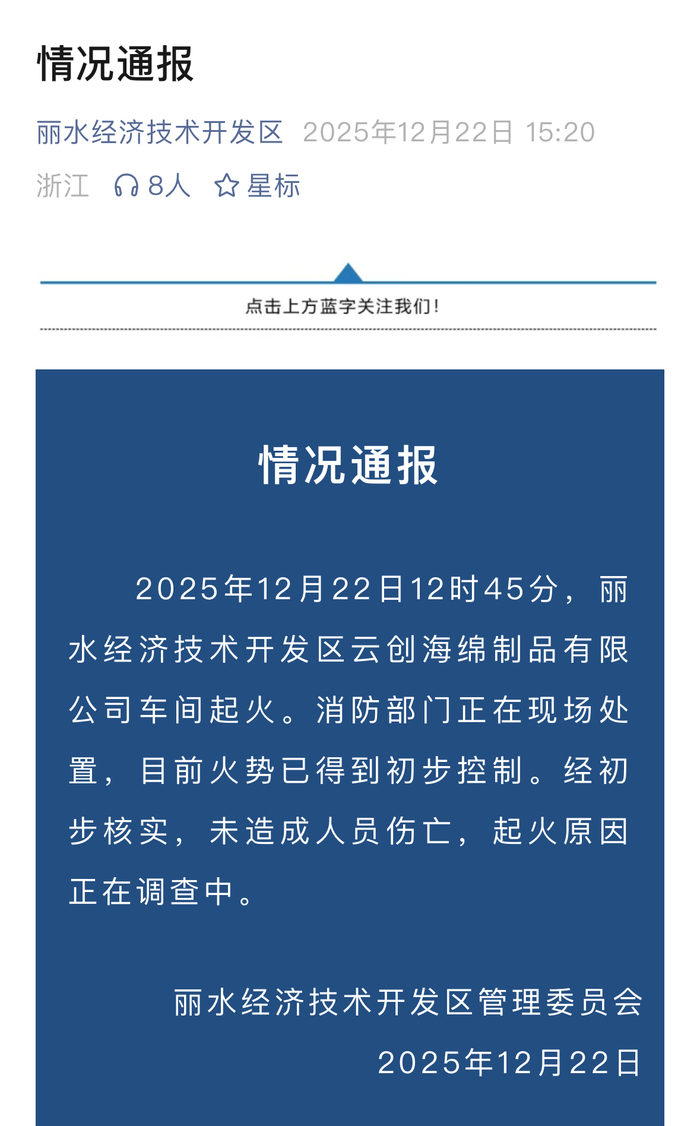 12月22日下午,丽水经济技术开发区管理委员会发布情况通报称,“2025年12月22日12时45分,丽水经济技术开发区云创海绵制品有限公司车间起火。消防部门正在现场处置,目前火势已得到初步控制。经初步核实,未造成人员伤亡,起火原因正在调查中。”