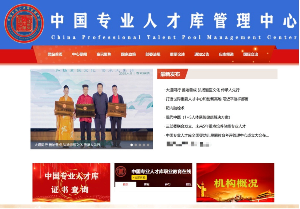 上述“中国专业人才库管理中心”网站设有多个栏目板块。其中,首页最新一条、显示发布于今年4月13日的消息称,“2025年4月11日,由中国国际经济技术合作促进会健康科技工作委员会与中总绝技绝活(北京)文化传播有限公司、中国专业人才库管理中心联合主办,中红集团、地宝集团承办的‘道医文化传承人’项目启动会在西双版纳隆重举行,来自全国各地的近300名专家学者参加了这一盛会。”