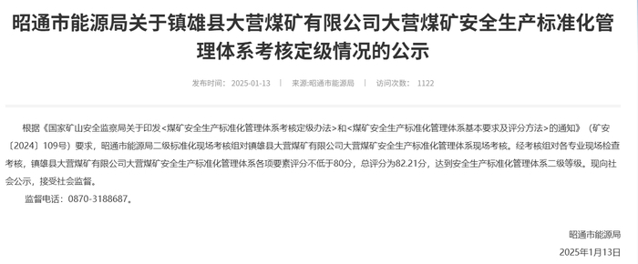 记者注意到,云南省昭通市能源局曾在2025年1月13日发布一则《关于镇雄县大营煤矿有限公司大营煤矿安全生产标准化管理体系考核定级情况的公示》,公示称,根据《国家矿山安全监察局关于印发<煤矿安全生产标准化管理体系考核定级办法>和<煤矿安全生产标准化管理体系基本要求及评分方法>的通知》(矿安〔2024〕109号)要求,昭通市能源局二级标准化现场考核组对镇雄县大营煤矿有限公司大营煤矿安全生产标准化管理体系现场考核。经考核组对各专业现场检查考核,镇雄县大营煤矿有限公司大营煤矿安全生产标准化管理体系各项要素评分不低于80分,总评分为82.21分,达到安全生产标准化管理体系二级等级。