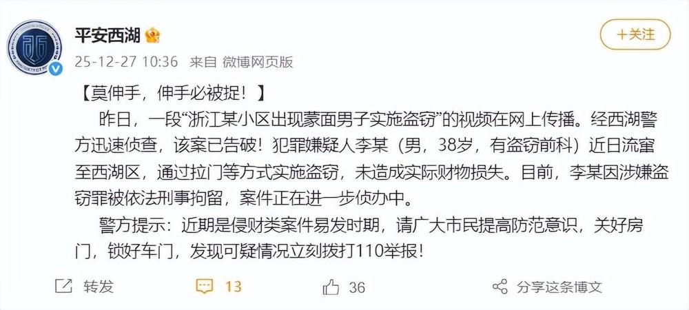 上午10点30分,西湖警方发布通报:昨日,一段“浙江某小区出现蒙面男子实施盗窃”的视频在网上传播。经西湖警方迅速侦查,该案已告破!犯罪嫌疑人李某(男,38岁,有盗窃前科)近日流窜至西湖区,通过拉门等方式实施盗窃,未造成实际财物损失。目前,李某因涉嫌盗窃罪被依法刑事拘留,案件正在进一步侦办中。