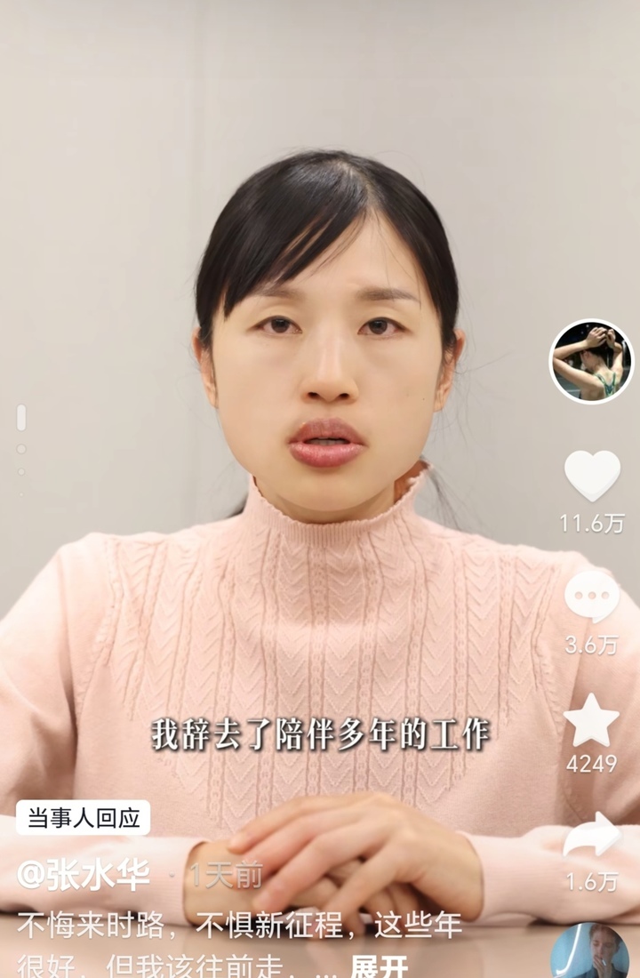 1月2日深夜,张水华在社媒视频里称:“大家好,我是张水华,我辞去了陪伴多年的工作,特别感谢医院的培养,领导的信任,还有同事们的包容与支持。真心祝愿大家越来越好。”另据新京报报道,张水华宣布辞职后向记者表示,已放下包袱,自己总要经历这一关,自己对医院工作不舍得,不知道会不会再当护士。
