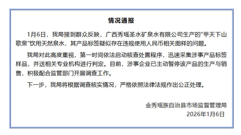 1月6日晚,广西金秀瑶族自治县市场监督管理局就“矿泉水包装疑似违规使用人民币相关图样”一事通报: