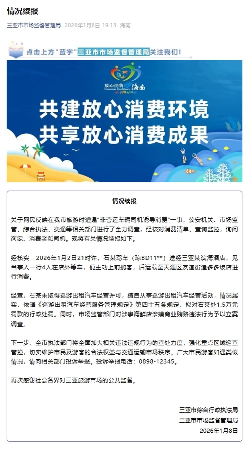 关于网民反映在我市旅游时遭遇“非营运车辆司机诱导消费”一事,公安机关、市场监管、综合执法、交通等相关部门进行了全力调查,经核对消费清单、查询监控,询问商家、消费者和司机。现将有关情况续报如下。