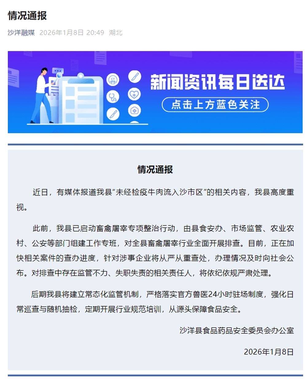 近日,有媒体报道我县“未经检疫牛肉流入沙市区”的相关内容,我县高度重视。