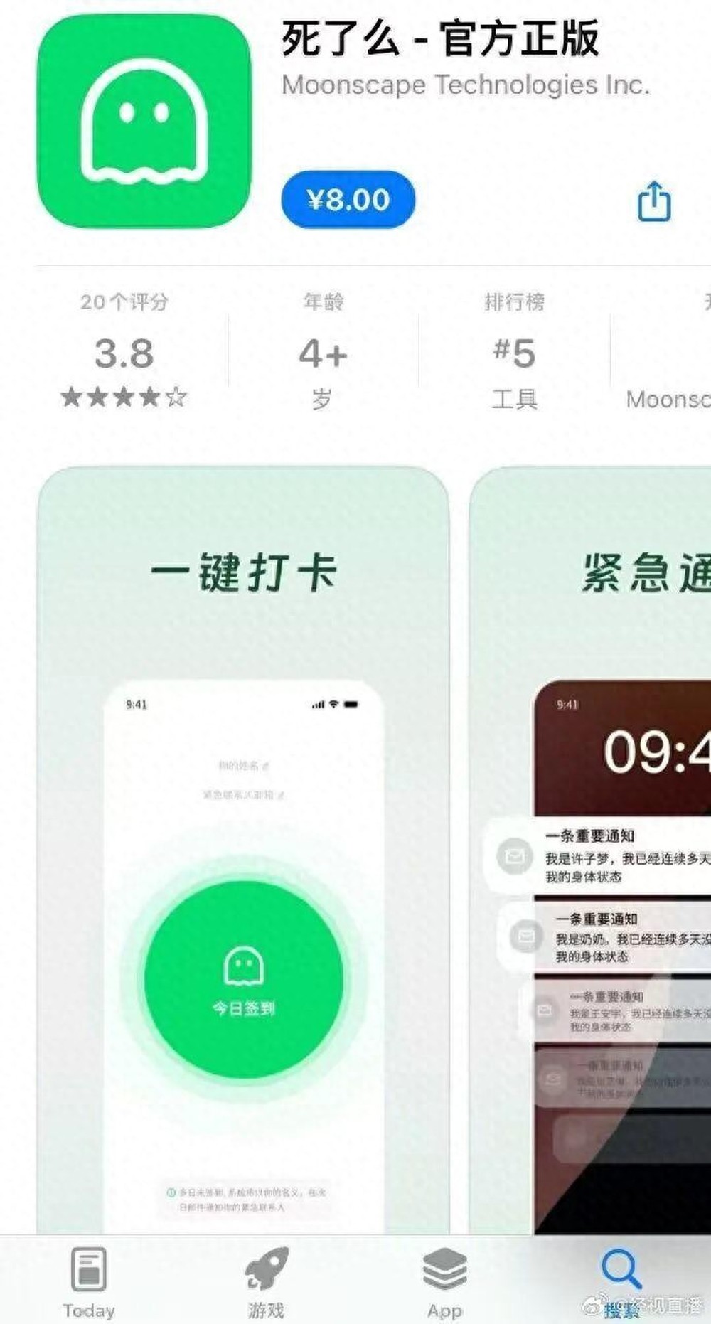 1月8日,苹果应用商店一款名为“死了么”的App受到关注。据介绍,该应用是为独居人群打造的轻量化安全工具,用户需要设置紧急联系人并签到,若连续多日没在应用内签到,系统将于次日自动发送邮件告诉紧急联系人。目前仅上线苹果应用商店,购买该软件需要8元人民币,安卓系统应用商店尚未上架。