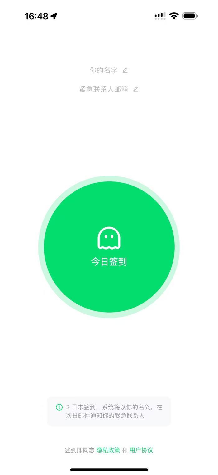 为了更好地了解该App的功能,新黄河记者也下载了该App进行体验,发现“死了么”App页面非常简洁。打开应用后,映入眼帘的是一个签到界面,使用前需要填写自己的名字和紧急联系人的邮箱等信息。在App的下方则有一栏提示语:2日未签到,系统将以你的名义在次日邮件通知你的紧急联系人。新黄河记者注意到,目前,该App下载量位列苹果工具类App排行榜第一位。