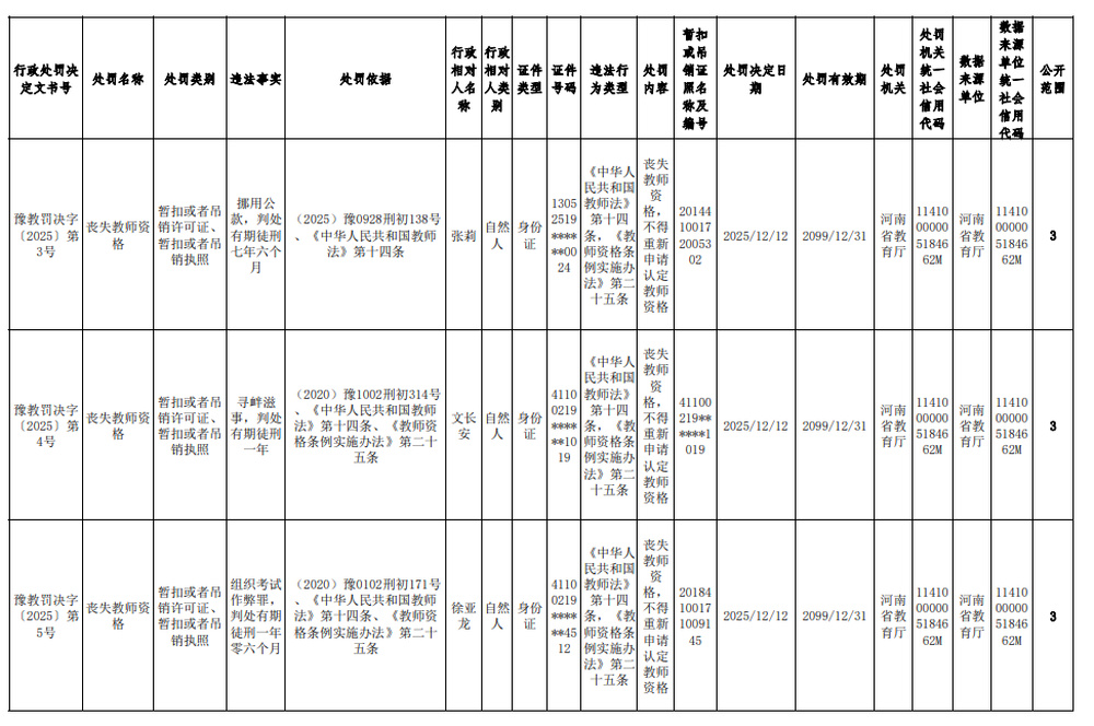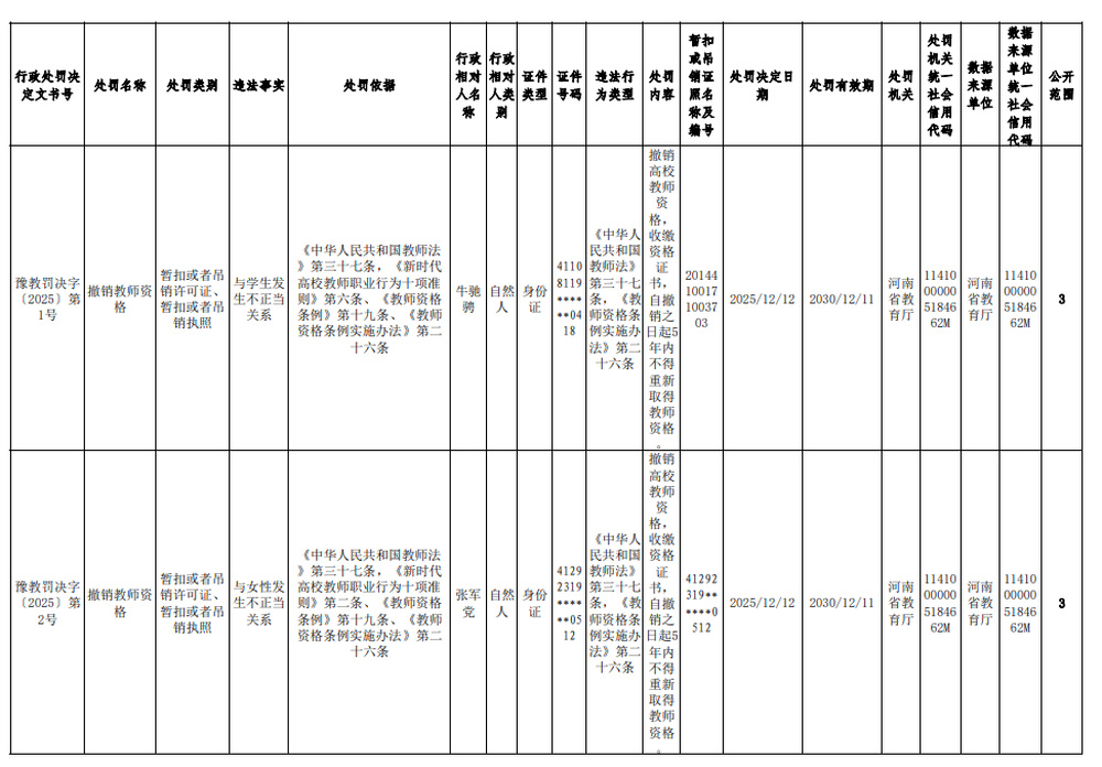 2025年12月31日,河南省教育厅发布“2025年撤销高校教师资格行政处罚” 的通报。通报对5名教师做出了撤销或丧失教师资格的处理。