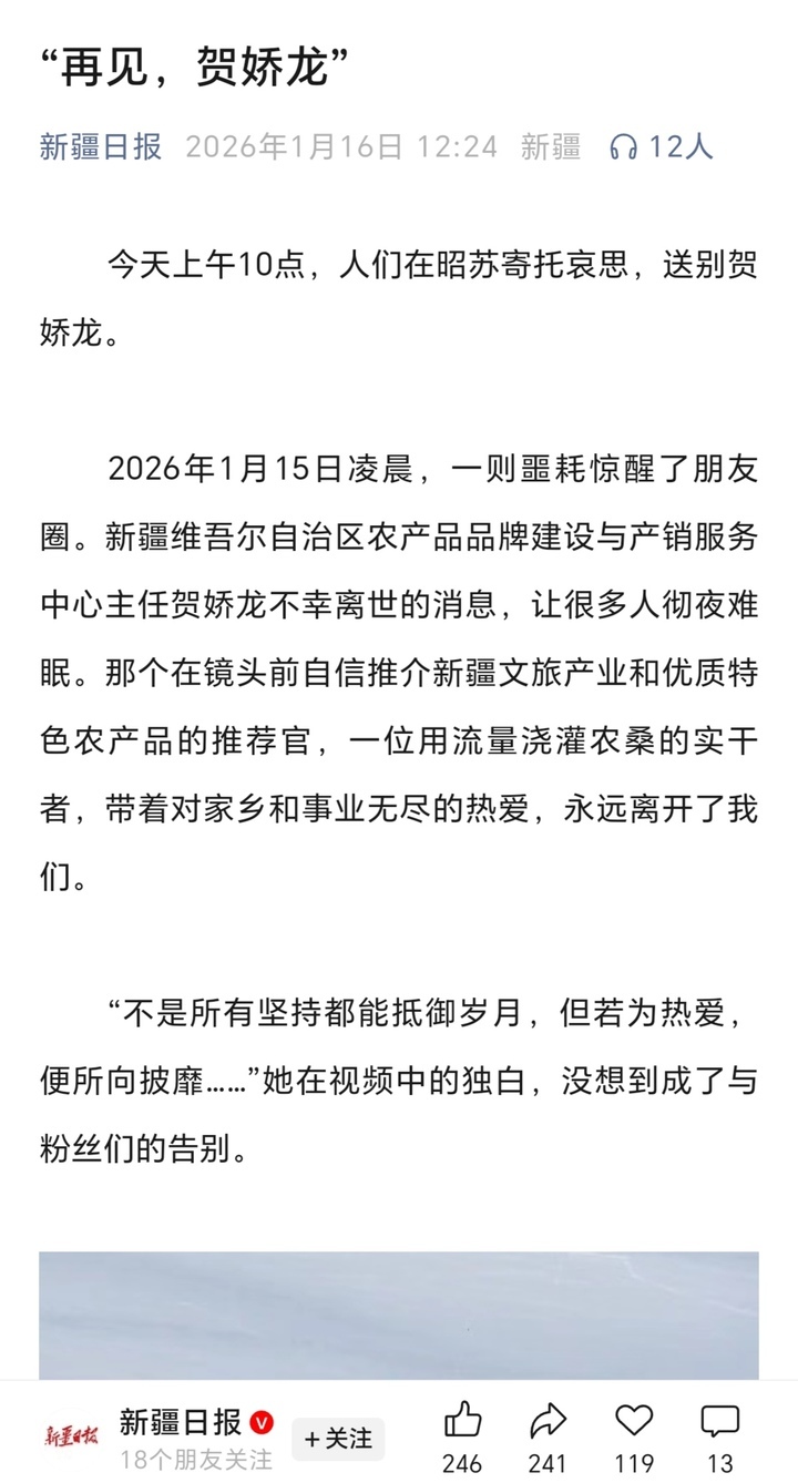 文章结尾部分写道:她曾直言,“我的目的不是成为网红,而是实实在在地需要流量转化,推进农副产品直播带货”。她还说,“如果流量有价值,那么就要让其变成田间地头的‘及时雨’”。这样的“及时雨”,也许就是贺娇龙对家乡最真挚的爱。虽已策马远行,但她播下的品牌兴农种子,已在天山南北生根发芽。从此,昭苏的风里有她的牵挂,新疆的果香里有她的坚守,“品味新疆”的品牌故事里,永远铭记着那个身披红袍、策马扬鞭的身影。再见,贺娇龙,你未竟的事业,一定会有更多人去接续完成。