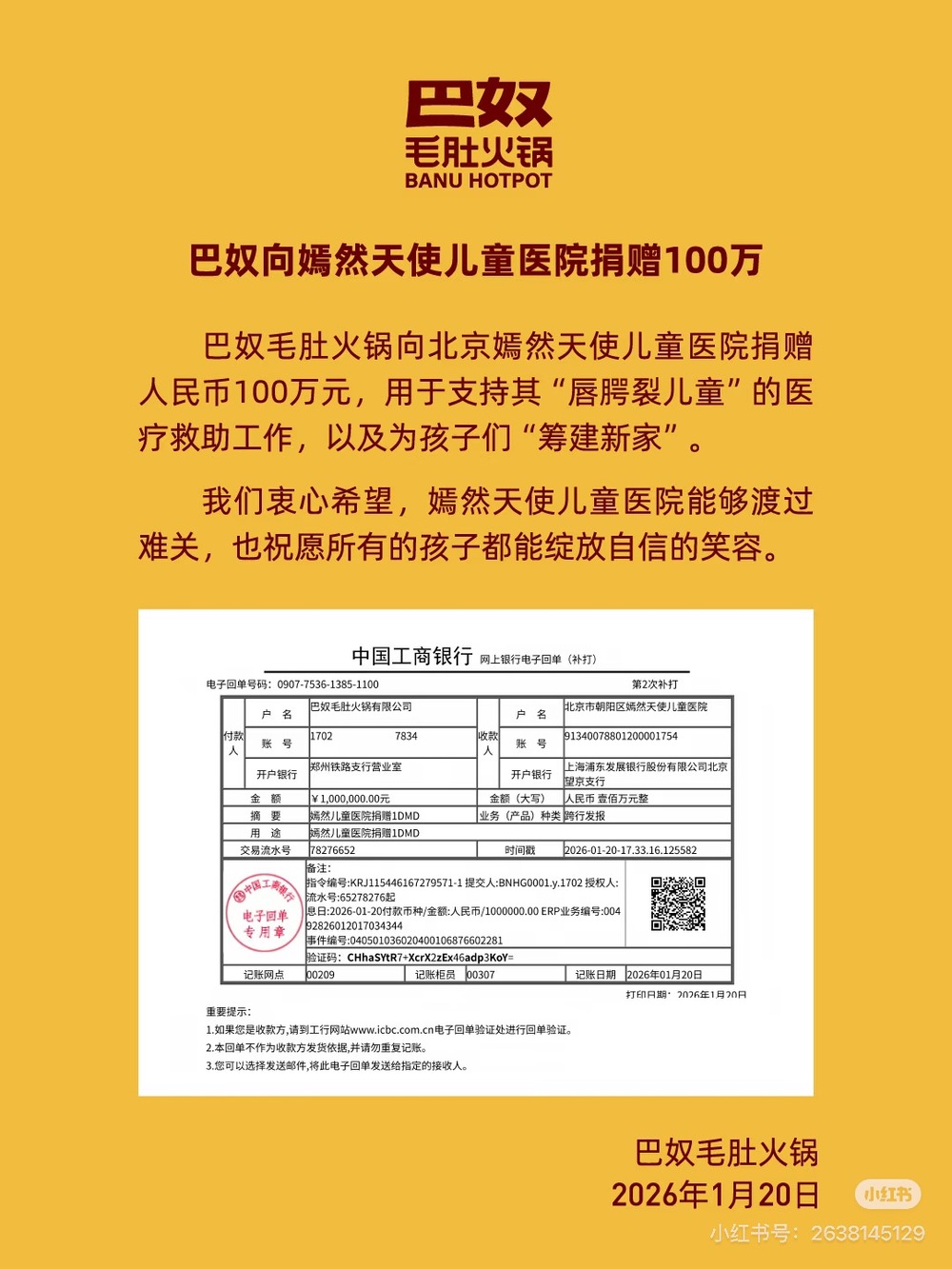 1月20日晚,巴奴毛肚火锅发文:向北京嫣然天使儿童医院捐赠人民币100万元,用于支持其“唇腭裂儿童”的医疗救助工作,以及为孩子们“筹建新家”。此前,已有多家企业向嫣然天使儿童医院捐款:卫龙捐款50万元;;豪士面包捐款30万元;伟龙零食捐款10万元;超格教育捐款10万元。