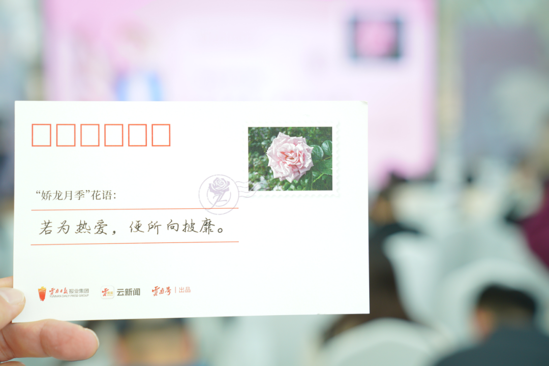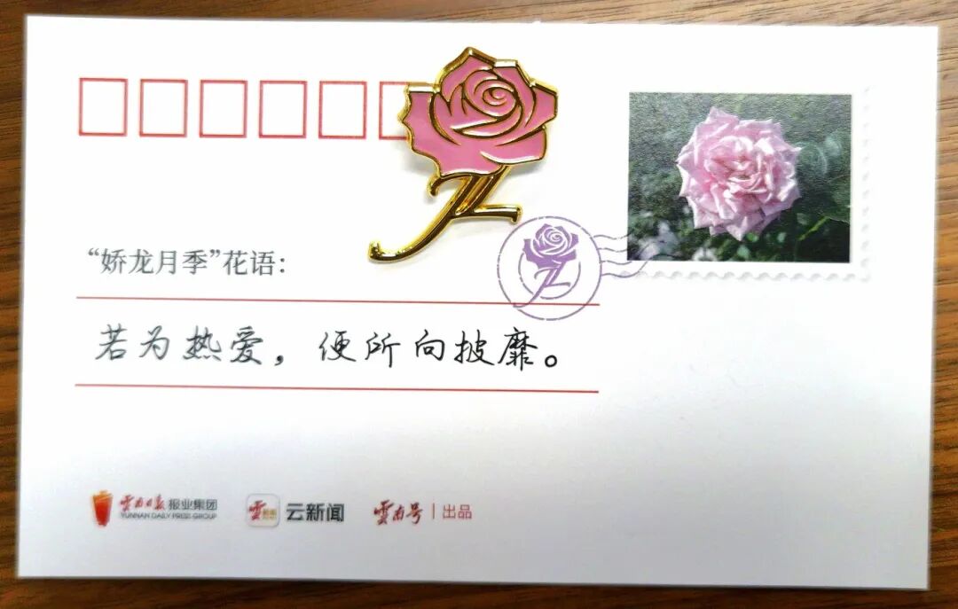 “娇龙”月季胸针和花语明信片。云新闻记者 邵琳鉴 摄