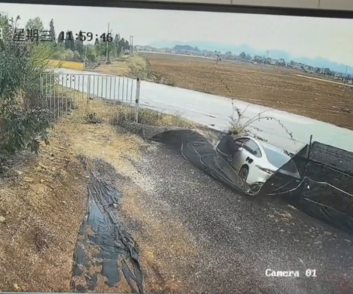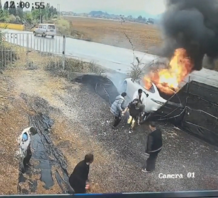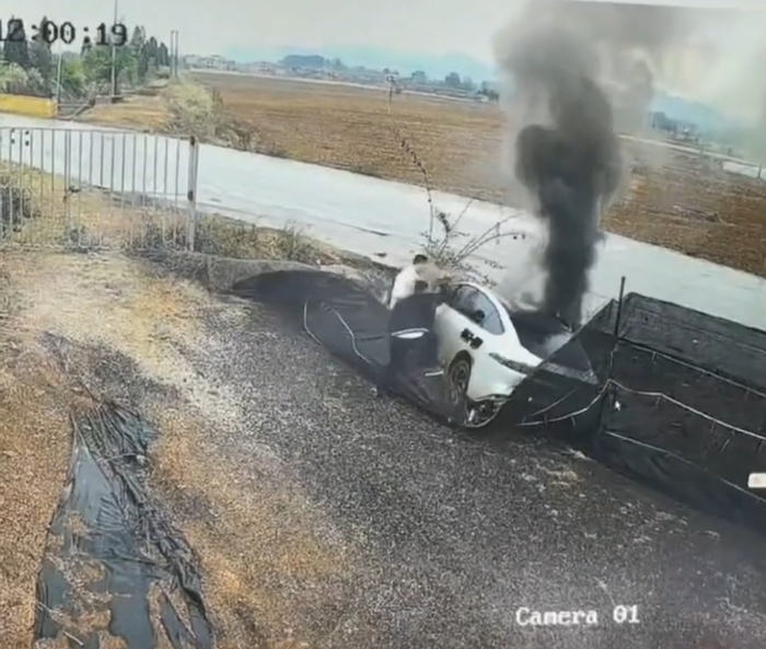 其发布的视频显示,在一段时间为星期三11:59的视频画面里,一辆白色车辆失控滑入道路旁的沟中,随即车身冒出浓烟,火势快速蔓延。驾驶员从驾驶座下车后,多次尝试拉开后座车门未果,又用胳膊肘撞击车窗,均未能打开,现场烟雾愈发浓烈。