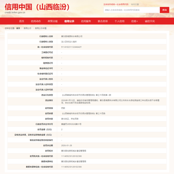根据上述网友提供的信息,记者在信用中国(山西临汾)官网“信用公示”板块关于行政处罚的公示专栏中看到,襄汾县住房和城乡建设管理局于1月28日对襄汾县清源供水有限公司作出行政处罚决定书,称其违法事实为:2026年1月15日,接临汾市城市管理局通知,襄汾县清源供水有限公司公共供水水质检测连续三年出现水质不合格情况,供水水质不符合国家规定标准。依据《山西省城市供水和节约用水管理条例》相关规定,对其责令改正并处罚款2万元。
