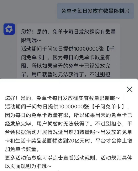 当晚,有网友发现,在千问App中输入口令后会出现感叹号标识,不再跳转点单页面。通过向千问客服询问得知,免单卡每日发放有数量限制。“活动期间千问每日提供10000000张【千问免单卡】,因为每日的免单卡数量有限,所以如果当天的免单卡已经发放完毕,用户就暂时无法获得了。不过别担心,平台会根据活动开展情况适当增加数量,当发放的免单卡和生活卡奖品总面额达到20亿元时,平台才会停止增加免单卡数量。”