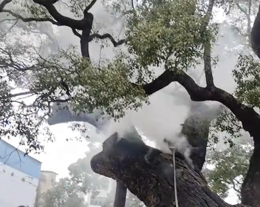 经工作人员紧急处置,明火已被扑灭,古树未被烧死,目前,起火具体原因仍在调查中。