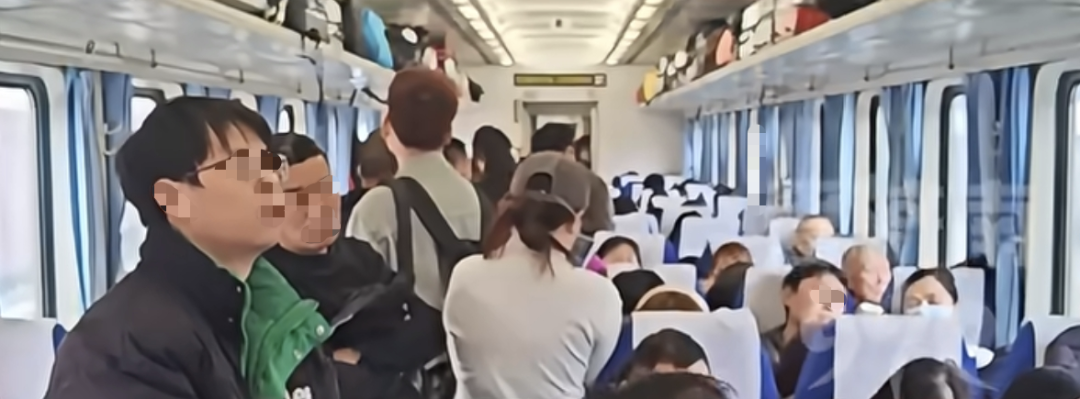 刘先生拍摄的视频画面中,车厢过道站满了人,广播里传来列车员的声音:“旅客们,由于列车超员影响运行,请所有无票人员抓紧时间下车。”