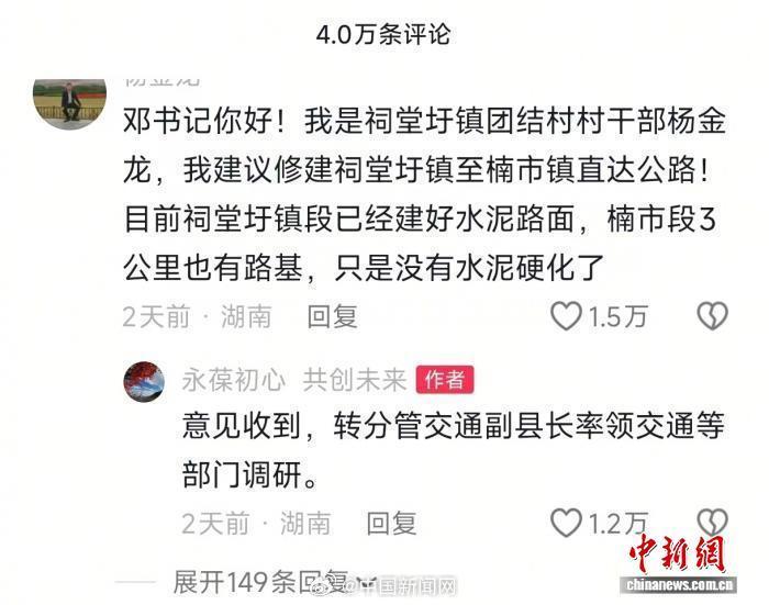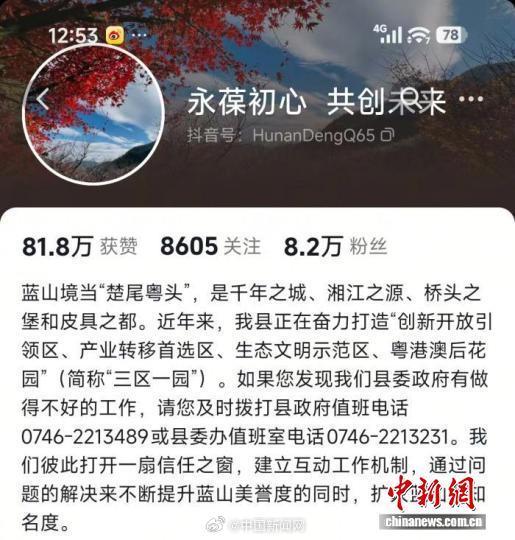 近日,湖南永州市蓝山县委书记邓群的个人社交账号,因对网友留言反映的民生实事挨个回复并给出处理意见,受到广大网友关注和互动。