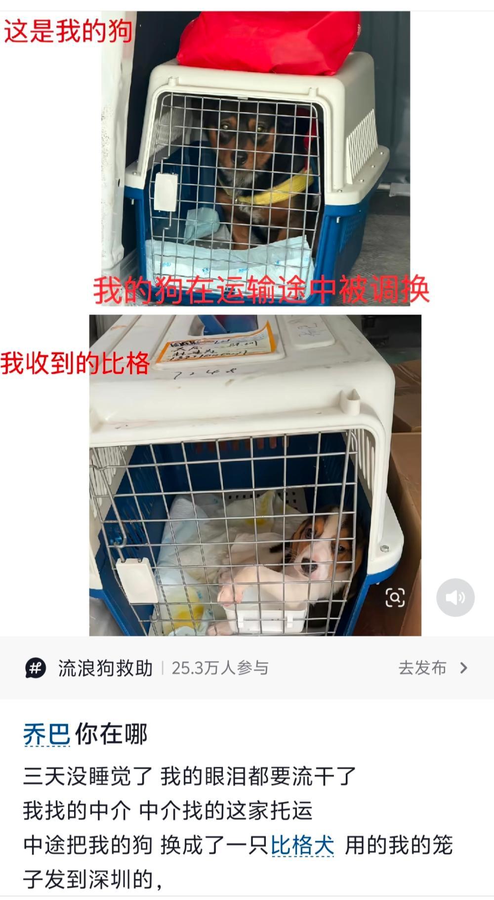 花580元托运发现狗被调包,主人发文苦寻爱犬