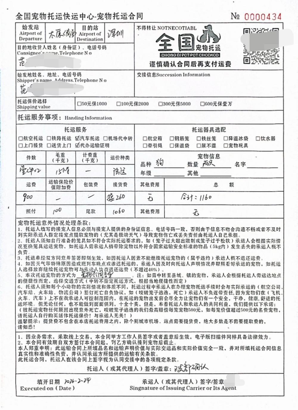 2月24日,范先生要返回深圳工作,便再次联系这家公司托运两只狗回深圳。“他们说回头客还能优惠200.最后两只狗收了1160元。”范先生告诉海报新闻记者,对方承诺全程空调开放、包办托运手续、途中喂食喂水并换尿垫遛狗,签订合同中提到,若狗中途死亡或丢失,出于人道主义会赔偿500元。
