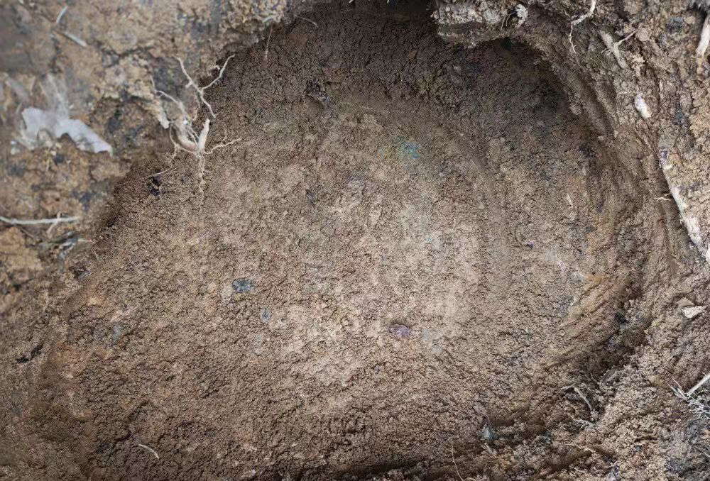 在新发现地点,考古人员清理出清晰的埋藏痕迹,发现一个与铜鼓形状完全契合的土坑,坑底残留鼓面蟾蜍印痕,据此推断该铜鼓为倒置埋藏。值得注意的是,蟾蜍在古代西南地区文化中常被视为“多子多福”和“财富丰饶”的象征,倒置埋藏或体现古人通过器物反转,将祈愿“灌入”大地、祈求神灵护佑的特殊祭祀意涵。经延伸发掘,未发现其他伴生遗物。而在1980年的出土地点,由于长期耕作和筑路等人为活动,原始埋藏痕迹已完全消失。考古人员通过查阅历史资料、走访当年亲历发现过程的村民,最终确认了老坑的原始位置。延伸发掘后,两处地点均未发现相关遗存或伴生文物,进一步印证两处铜鼓为独立埋藏的祭祀遗存。