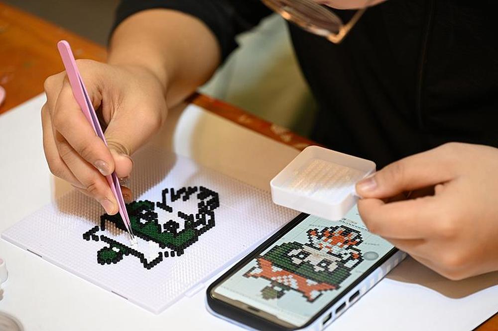 北京中小学寒假最后一天,在北京京西大悦城的一家手工DIY小店里,不少人都低着头,专注地摆弄着眼前的彩色小颗粒。店员田分分忙前忙后,熨烫成品、递送工具,脚步几乎不曾停下。她告诉记者,这个寒假,小店天天爆满,一座难求。店里有拼豆、陶艺、石膏娃娃、奶油胶等二三十种手工项目,而这段时间拼豆人气大涨,九成顾客都是来这里拼豆。学生群体,更是拼豆的主力军。