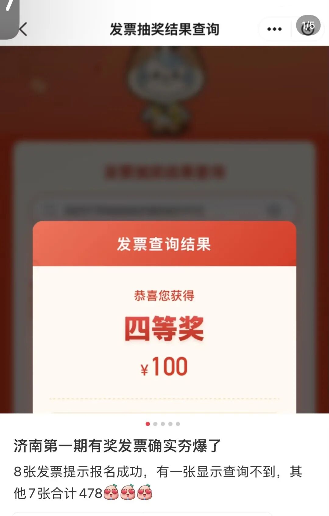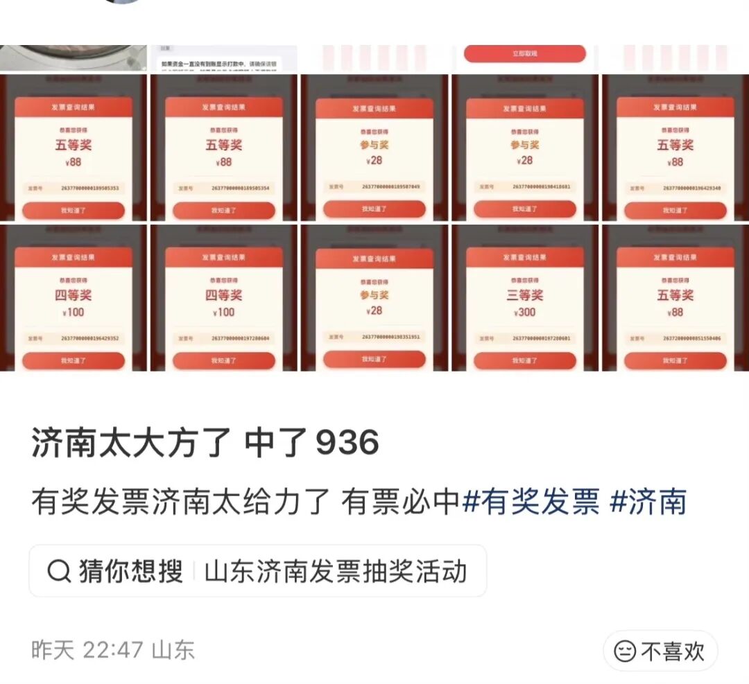 很多济南网友也在社交平台晒出自己的发票中奖“战绩”。