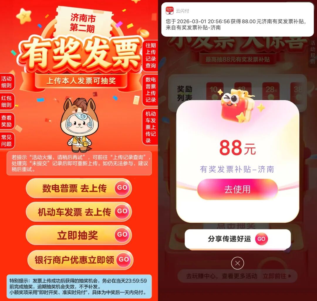 值得一提的是,济南的第二期活动奖金池扩容至8000万元,较首期增加了3000万元,中奖概率同步提升。凡是2月9日以来开具的发票,只要未在首期活动中上传过,这次都可以继续参与。
