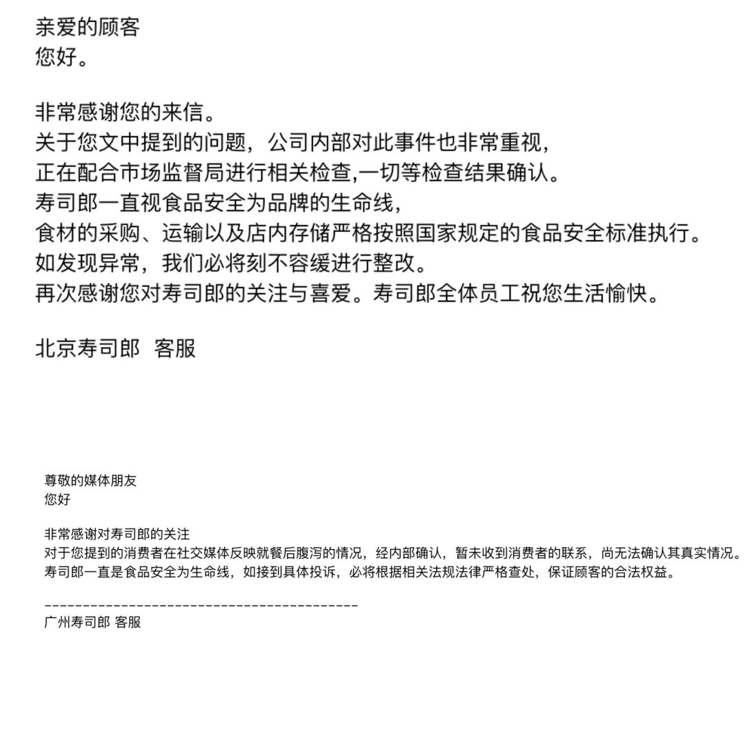 3月13日,广州寿司郎客服邮件回应称,对于上述消费者在社交媒体反映就餐后腹泻的情况,经内部确认,暂未收到消费者的联系,尚无法确认其真实情况。对方还表示,寿司郎一直视食品安全为生命线,如接到具体投诉,必将根据相关法规法律严格查处,保证顾客的合法权益。