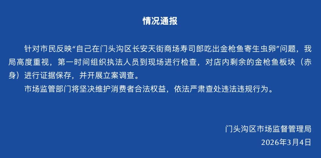 3月4日,北京市门头沟区市场监督管理局发布通报称,第一时间组织执法人员到现场进行检查,对店内剩余的金枪鱼板块(赤身)进行证据保存,并开展立案调查。