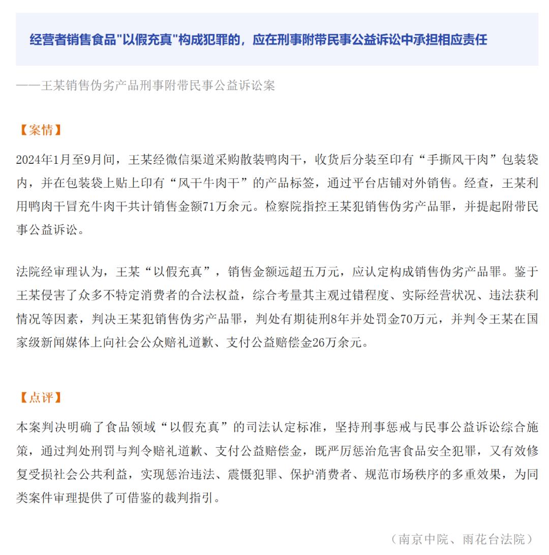 2024年1月至9月间,王某经微信渠道采购散装鸭肉干,收货后分装至印有“手撕风干肉”包装袋内,并在包装袋上贴上印有“风干牛肉干”的产品标签,通过平台店铺对外销售。经统计,王某利用鸭肉干冒充牛肉干共计销售金额71万余元。雨花台区检察院指控王某犯销售伪劣产品罪,并提起附带民事公益诉讼。