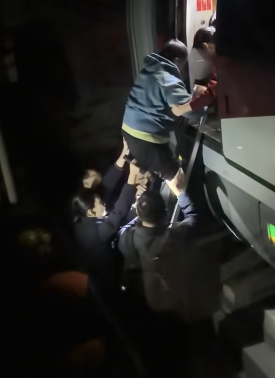 现场旅客拍摄的多段视频显示,天色已黑,在铁路工作人员的扶助下,G178次列车上的乘客相继顺着一人多高的应急梯下到轨道,而后再顺着梯子爬上旁边的救援列车。有年纪较大乘客颤颤巍巍爬上梯子,在下方多名工作人员手持电筒照明,用双手守护下,最终顺利登上救援列车。