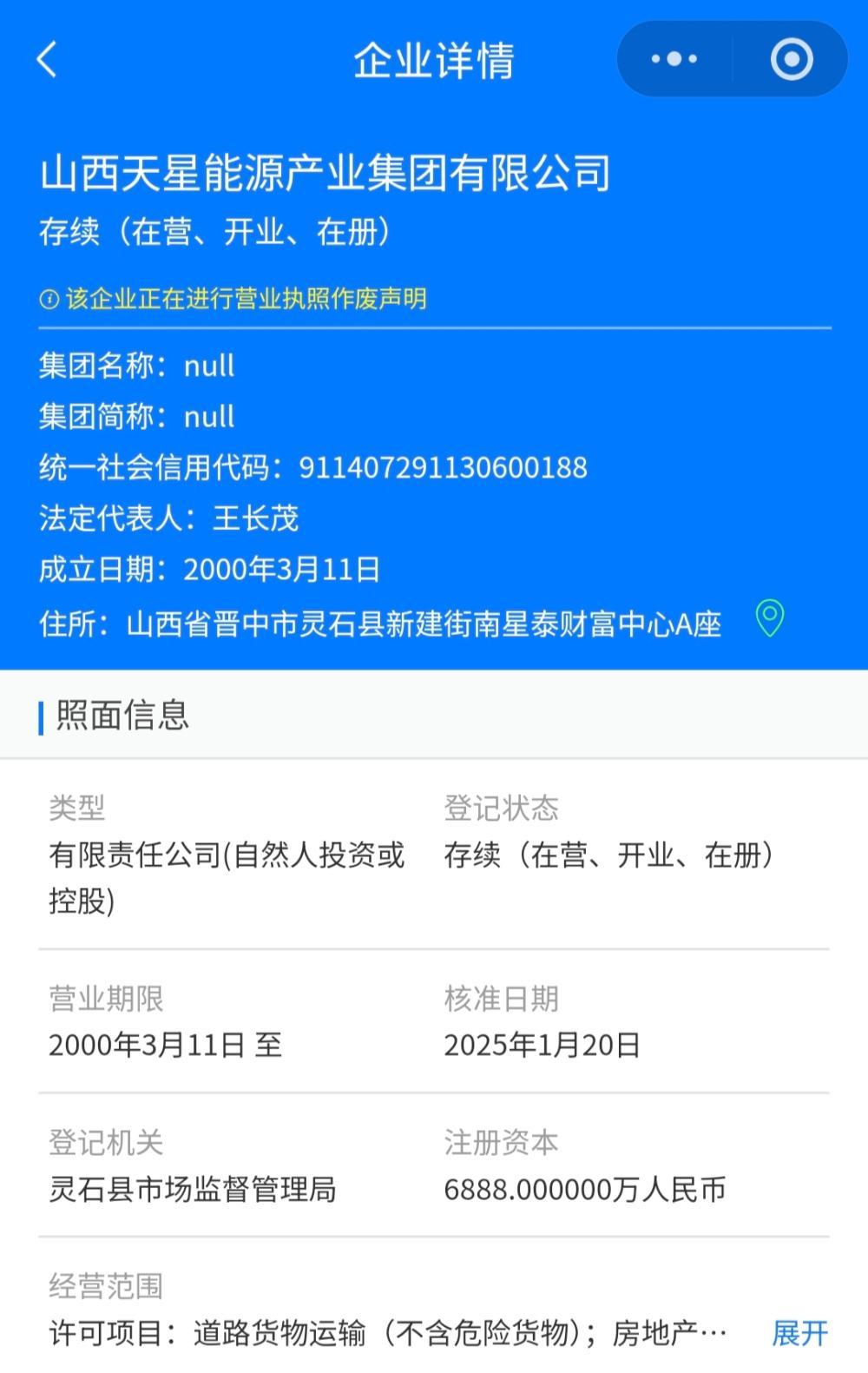 记者20日通过天眼查查询发现,山西天星能源产业集团有限公司(简称“天星集团”)注册资本金6888万元。据晋中市工商业联合会2024年发文介绍,天星集团进入2024山西省民营企业100强榜单,列第58位。2025年9月18日,山西省工商联发布2025山西省民营企业100强榜单,该集团继续上榜。