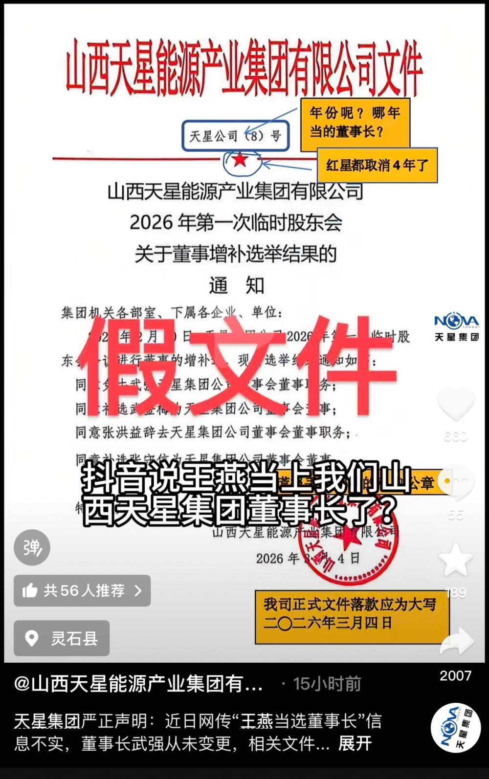 不久前,名称为“山西天星能源产业集团有限公司”的抖音账号、名称为“天星融媒”的微信公众号账号发布消息称,王燕当选天星集团公司董事长,但两账号均未获平台认证。文中公布的文件显示,2月10日,天星集团召开临时股东会、董事会,王燕当选为集团公司董事长,武金梅为副董事长,免去武强的集团公司董事职务,公司法定代表人为王长茂不变。多份文件落款时间是2026年3月4日,并加盖企业公章。至20日19时许,该抖音账号已清空视频,但“天星融媒”微信公众号账号并未删除此文章。