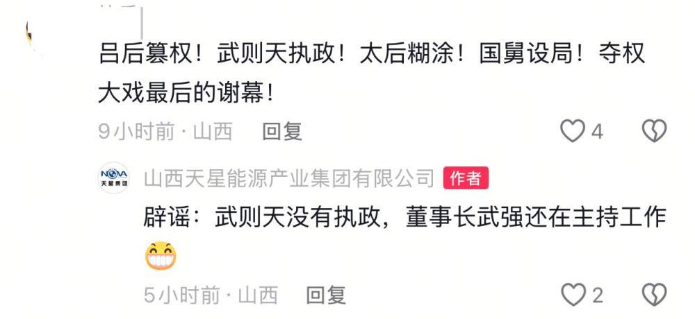 然而,3月20日,另一个同样名为“山西天星能源产业集团有限公司”的抖音账号发布了“董事长变更为王燕不属实”的视频。该视频称,王燕当选为天星集团公司董事会董事长的文件,有多处不符合公司现行文件格式,“文件一眼假,是她自己打印自己盖章的”。该视频称,正式使用20多年的公章在公司,并未丢失或失控,而王燕谎报丢章后刻的新章在她自己手里,两章编码不同。视频中还说,发布上述文件的社媒账号没有企业认证,系已被免职的员工杨某的个人账号。20日,该账号在评论区回复网友评论称,董事长武强以企业大局公司稳定为重,不愿参与舆论口水战,以家族和股东利益为先,个人名誉为后,对负面造假信息不予回应,针对王燕团伙对其个人的恶意造谣、不实言论保持克制,但面对继续抹黑天星、破坏公司稳定的行为,不能坐视不管,并称:请大家认准我们官方抖音号,我们是企业官方认证号,以此信息为准。该账号称,武强是王长青的儿子,王燕为王长青的女儿,两人是同父同母亲兄妹。有网友评论称“吕后篡权,武则天执政,太后糊涂,国舅设局,夺权大戏最后谢幕”,该账号回复:“辟谣,武则天没有执政,董事长武强还在主持工作。”记者注意到,该抖音账号得到平台蓝V认证,并公布了营业执照。