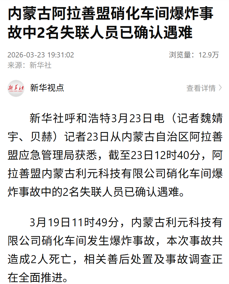 记者23日从内蒙古自治区阿拉善盟应急管理局获悉,截至23日12时40分,阿拉善盟内蒙古利元科技有限公司硝化车间爆炸事故中的2名失联人员已确认遇难。