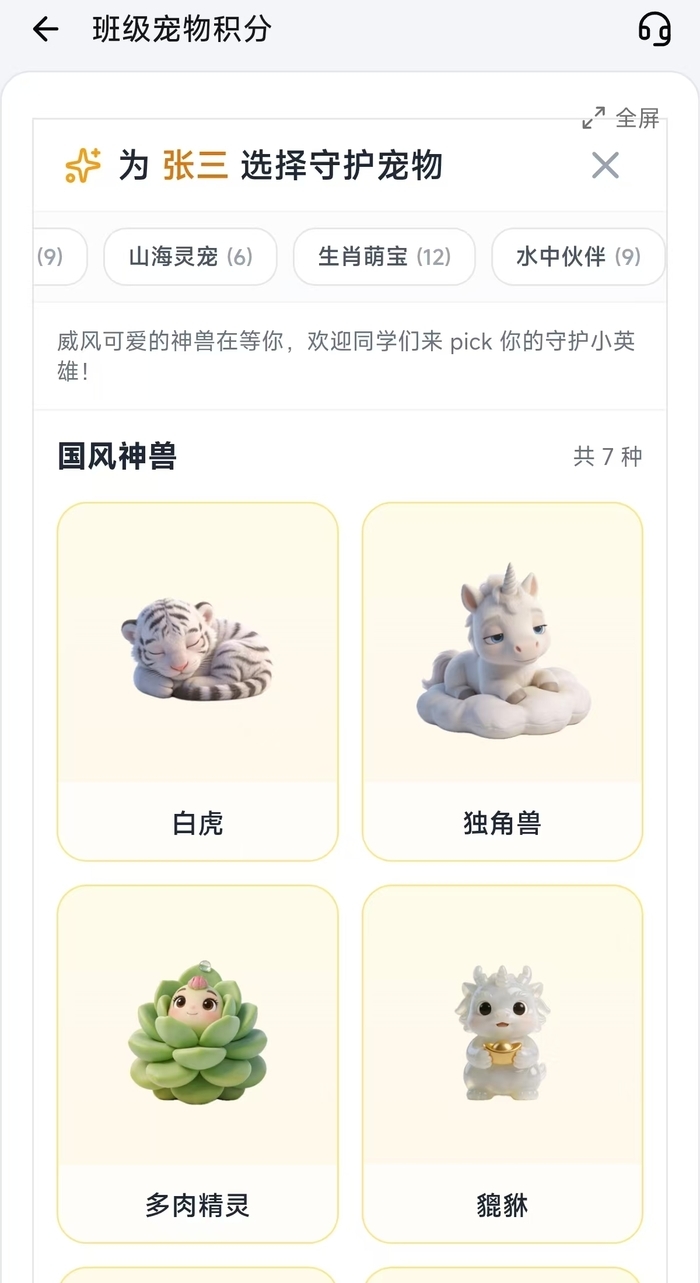 据陈老师介绍,她所使用的是一款APP内免费的“班级宠物积分”功能。记者下载该软件后发现,其班级宠物功能中包含90余种设计可爱的电子宠物,涵盖西高地、安哥拉兔、萨摩耶等常见萌宠,以及十二生肖、山海经神兽等特色形象,能够满足不同学生的喜好。该功能还设置了明确的积分规则,其中包括作业完成优秀、默写全对、课堂积极发言等加分项,以及不交作业、未完成作业、课堂违纪等减分项,电子宠物的积分累计达到一定等级后,便可解锁新的形态,实现“升级”。