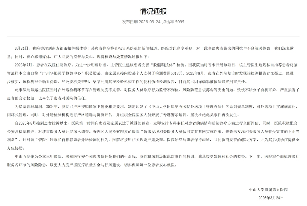 3月24日,中山大学附属第五医院发布情况通报称,24日,该院关注到南方都市报等媒体关于某患者住院检查报告系伪造的新闻报道。医院对此高度重视,对于此事给患者带来的困扰与不良就医体验,我们深表歉意;同时,衷心感谢媒体、广大网友的监督与关心。现将核查与处置情况通报如下: