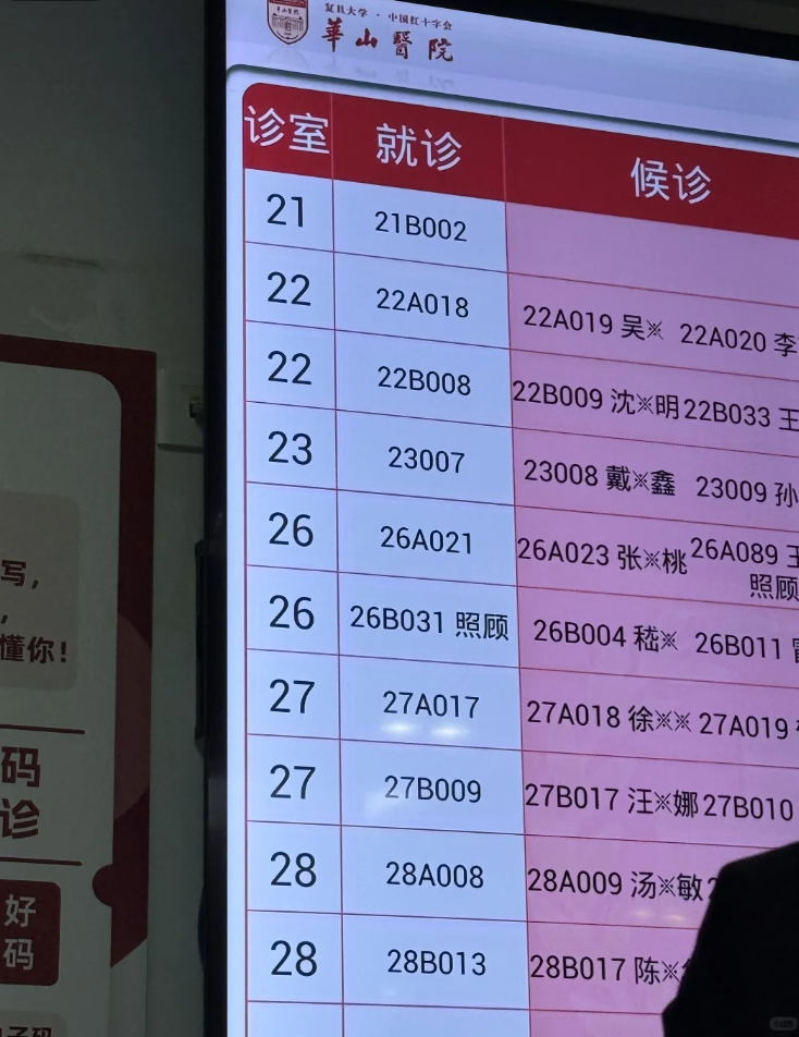 3月25日,有博主在社交平台发帖询问“华山医院候诊牌上的‘照顾’号是什么意思”,并配发候诊屏幕照片。画面显示,在上海复旦大学附属华山医院门诊排号屏上,除正常排号外,部分号码被标注为“照顾”。