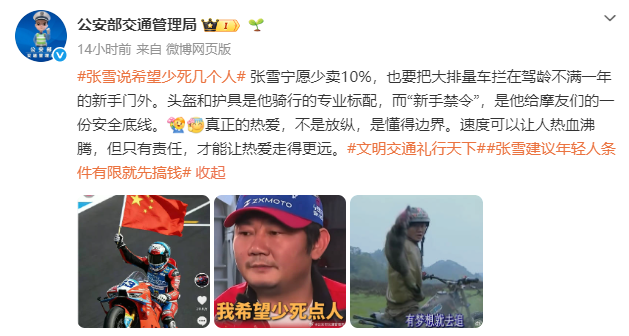 公安部交通管理局昨天发微博力挺张雪机车“新手禁令”称,这是给摩友们的一份安全底线。“真正的热爱,不是放纵,是懂得边界。速度可以让人热血沸腾,但只有责任,才能让热爱走得更远”。