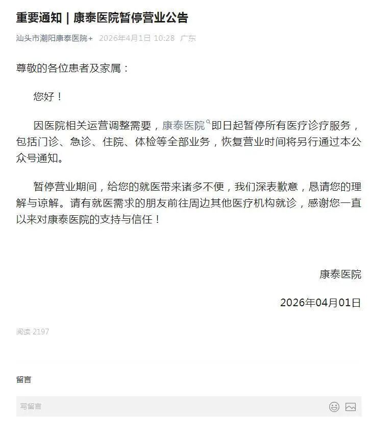 4月1日,该院公众号发公告称,因医院相关运营调整需要,康泰医院即日起暂停所有医疗诊疗服务,包括门诊、急诊、住院、体检等全部业务,恢复营业时间将另行通知。